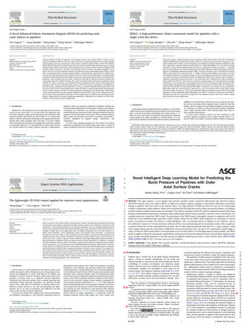 其中,以第一作者身份在JCR TOP期刊《Thin-Walled Structures》(IF:6.6)发表的2篇论文《ESDLC: A high-performance failure assessment model for pipelines with a single crack-like defect》和《A Novel Enhanced Failure Assessment Diagram (EFAD) for predicting axial crack failures in pipelines》,以及以第二作者兼通讯作者身份在JCR Q3期刊《Journal of Pipeline Systems Engineering and Practice》(IF:1.7)发表的论文《A novel intelligent deep learning model for predicting the burst pressure of pipelines with outer axial surface cracks》,聚焦管道结构安全评估,针对管道外表面轴向裂缝评估这一行业核心难题,创新性提出两种裂缝评估理论模型与一种人工智能预测模型,有效解决了应力与腐蚀耦合作用下的管道运行安全问题,显著提升了工程实用性。